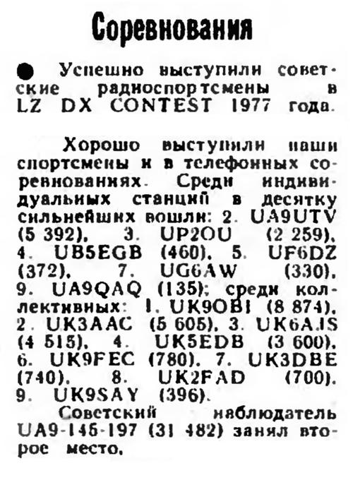 Радио №07 1978 UK9OBI и UA9-145-197 в LZ DX Contest 1977