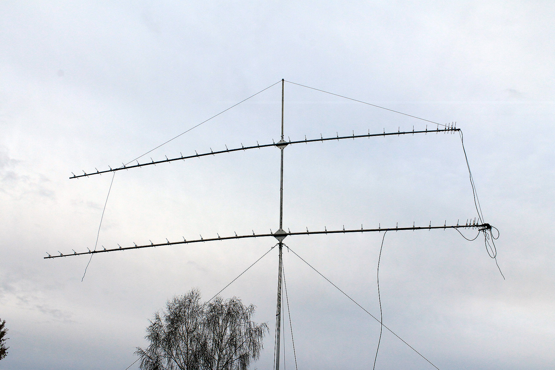 Закрепил антенны на мачте, стал поднимать - не смог поставить. Пришлось укорачивать мачту. Поставил. 6 метров от земли нижняя стрела + 2 метра до верхней.